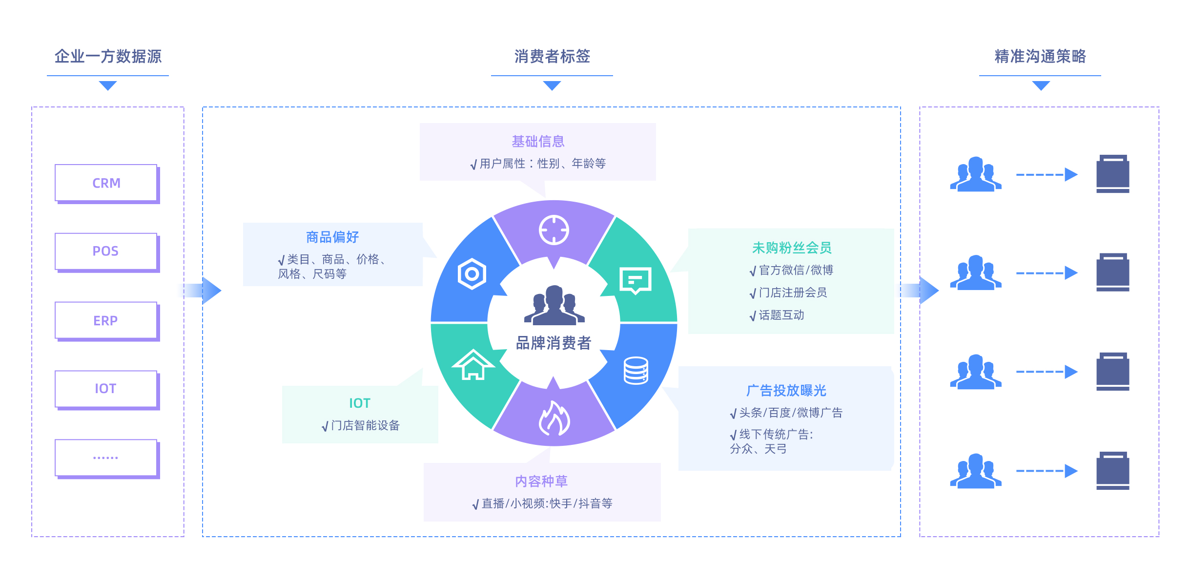 全环节数据汇集、融合、打通,数据加工,提炼价值数据,基于价值数据实现客户洞察以及人货匹配。